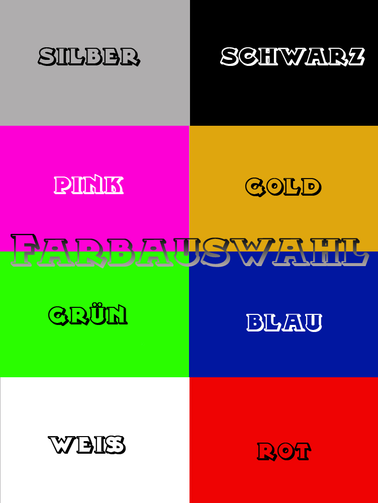 schwarz, weiß, silber, rubinrot, grün, pink, dunkelblau, gold